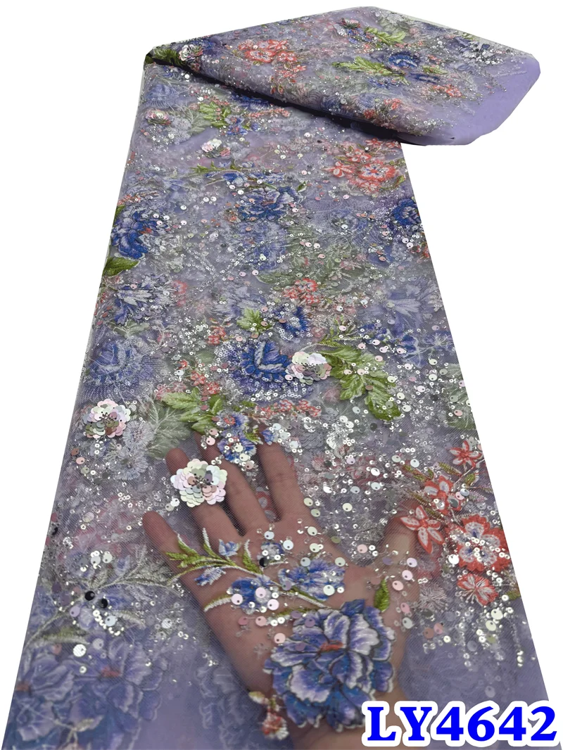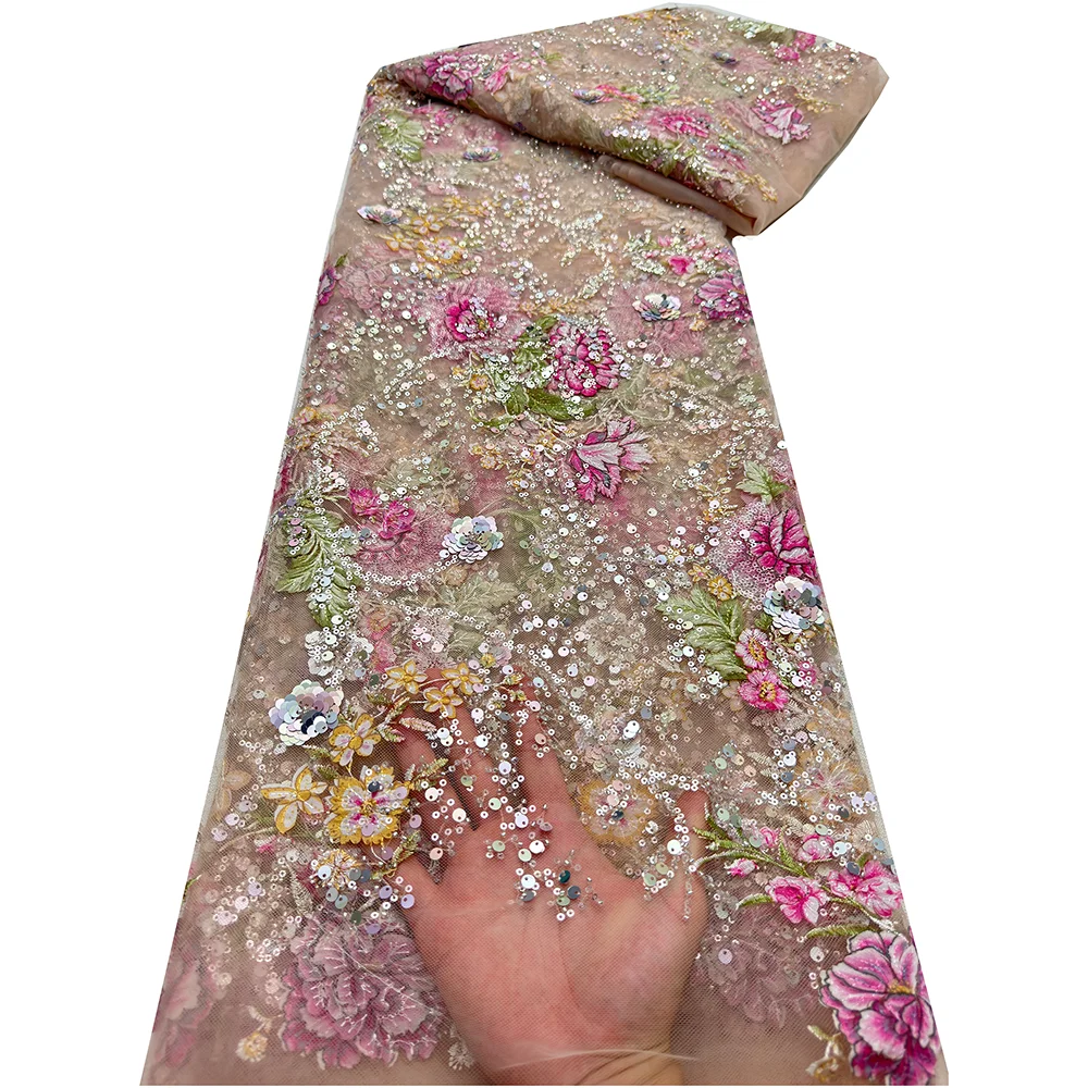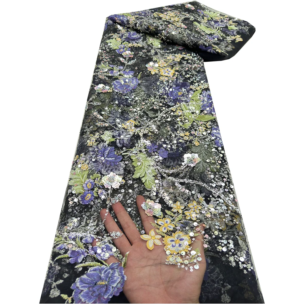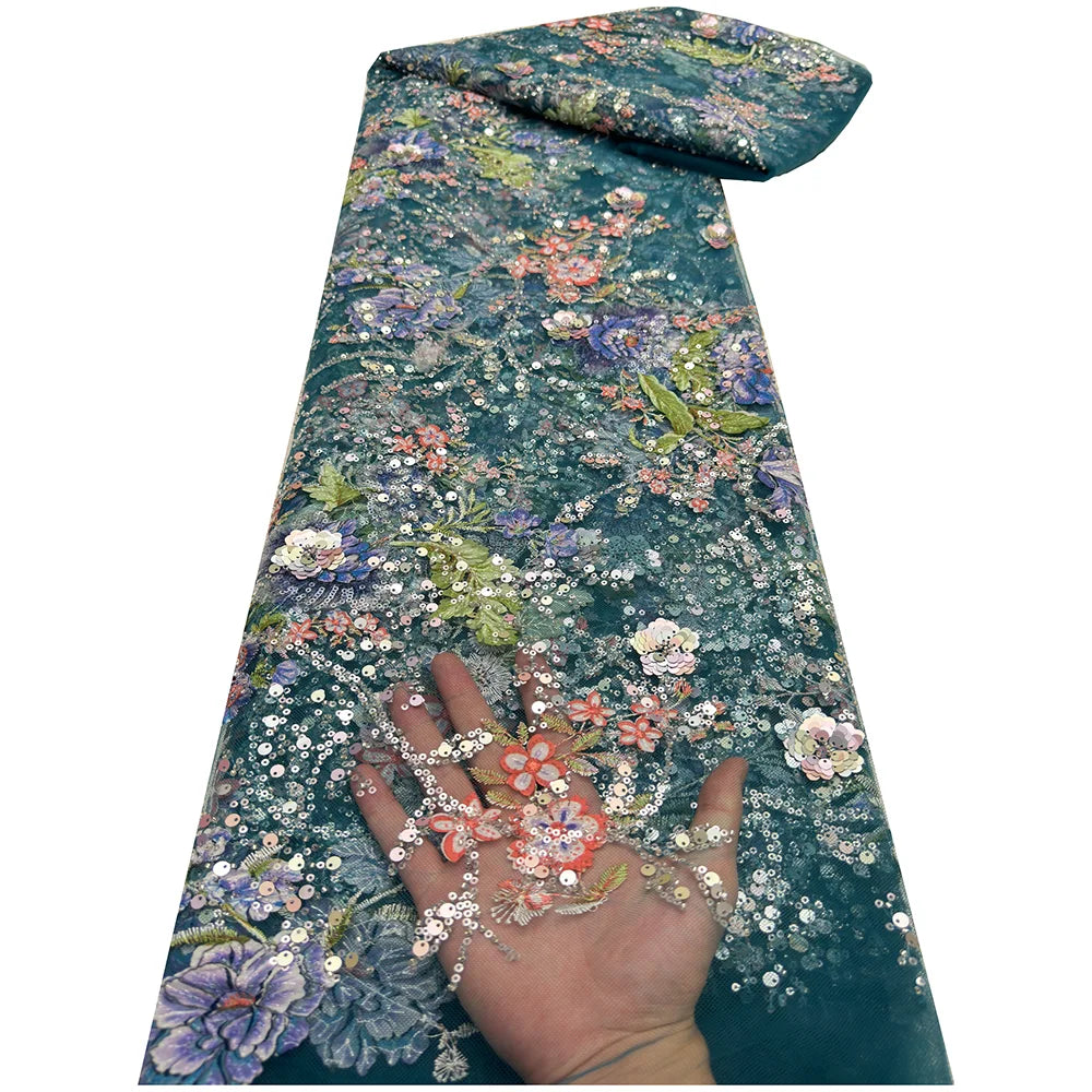 2023 Blue 3D Flower Lace Fabric With Pearls High Quality French Heavy Bead Tulle African Fabric For Wedding Party Dress Sewing