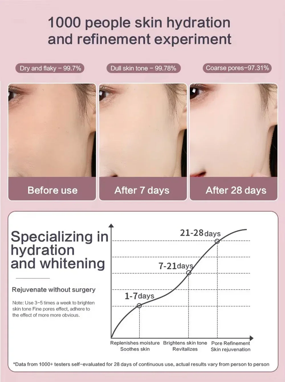 3. It is an excellent companion for facial masks and skin care products. It can promote the skin's absorption of subsequent skin care products, double the nourishment, effectively relieve sensitivity, repair sunburned skin, keep the skin hydrated and plump all day long, and glow with a natural and healthy radiance.
