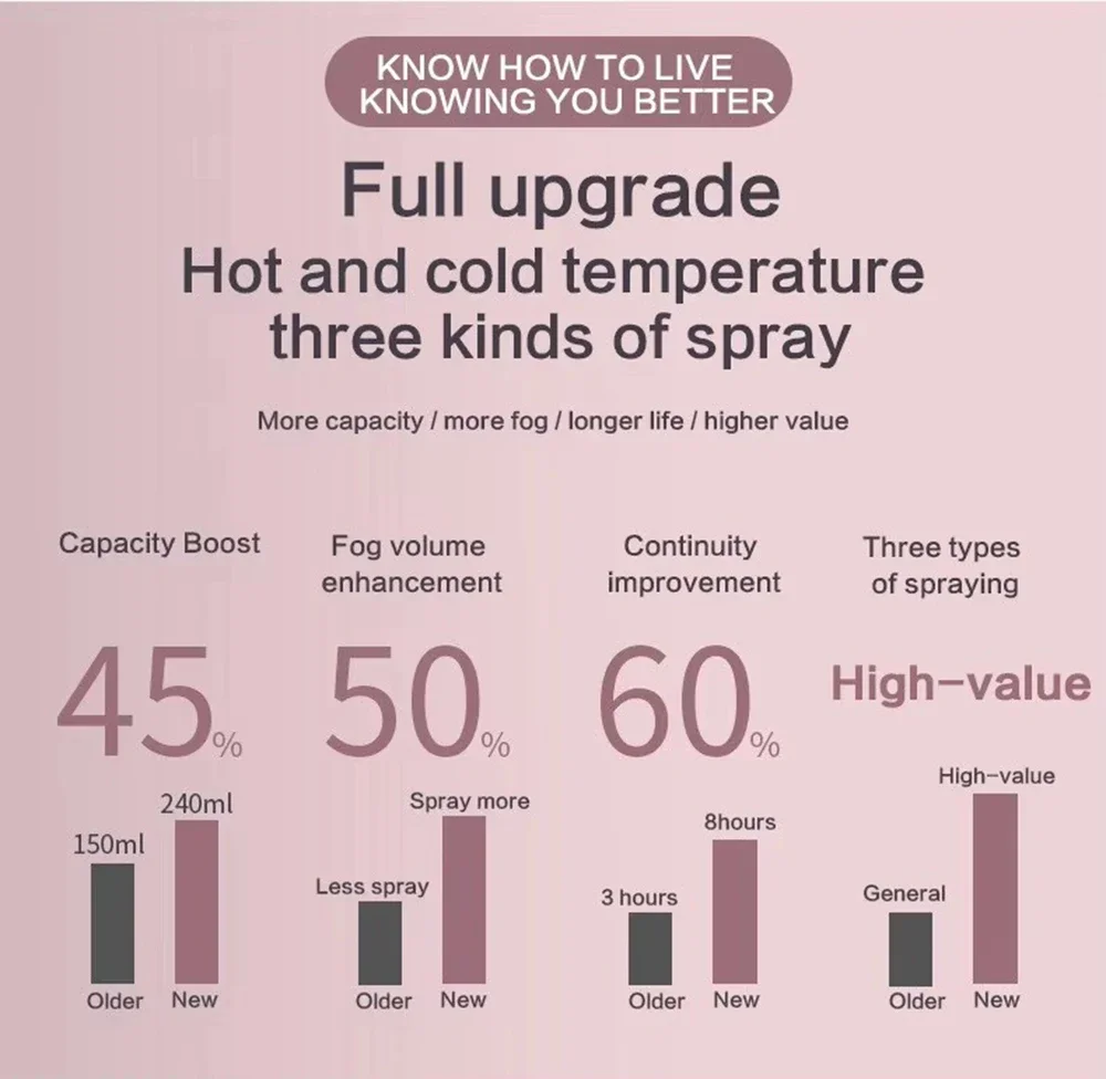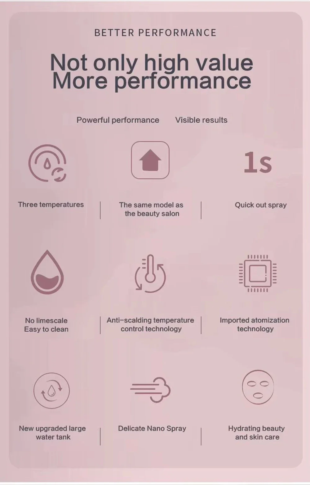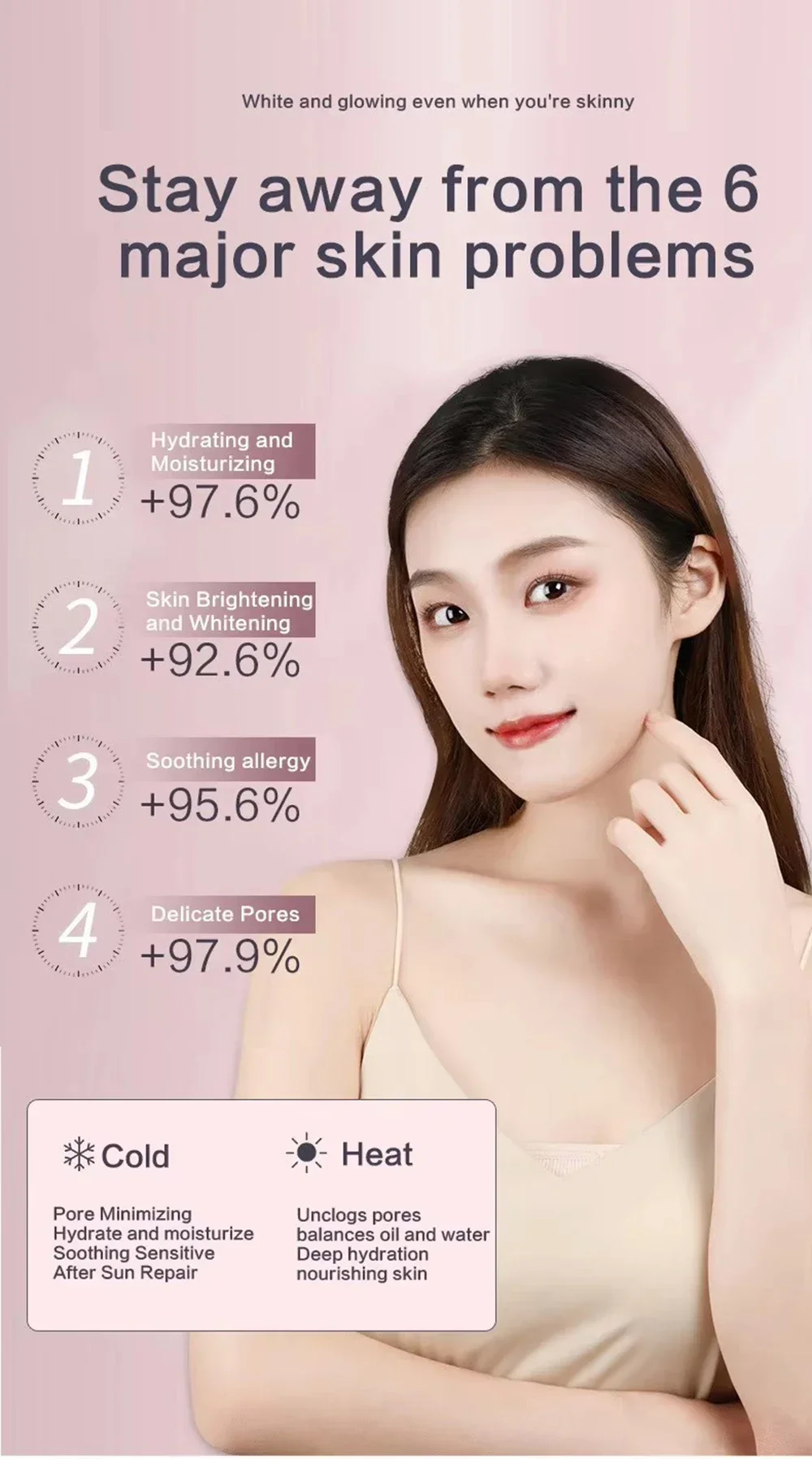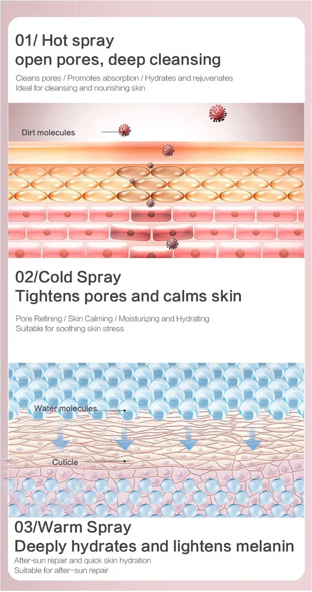 4. Hot spray gently opens the pores and deeply cleans the dirt and oil inside the skin; cold spray helps tighten pores, calm the skin, and bring immediate relief; warm spray deeply hydrates, dilutes melanin, and makes the skin glow with natural radiance.