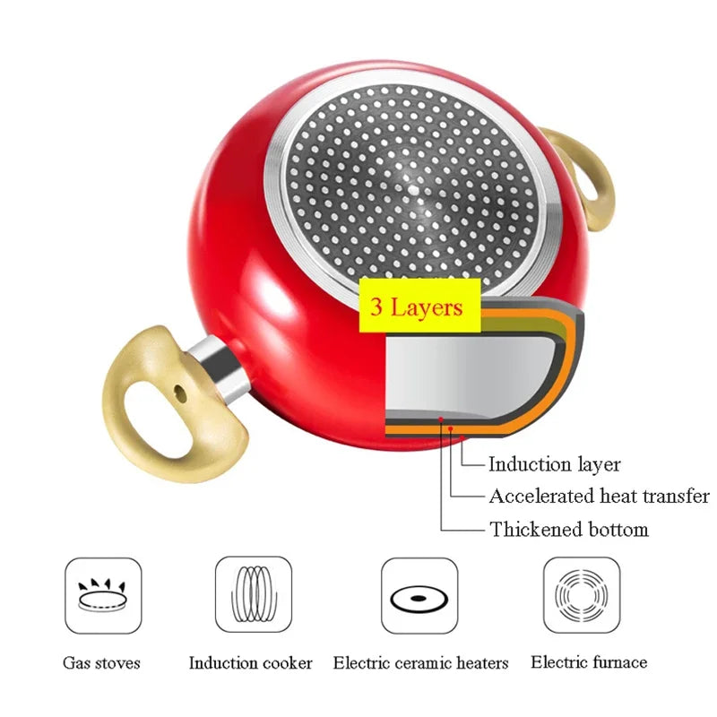 This is a high-quality kitchen non-stick aluminum pan with fruit shape design, anti-scalding handle design, suitable for gas stove, induction stove, electric ceramic stove, electric heating stove. The product conducts heat quickly, speeding up the cooking time. Packed in a colorful bubble box for safe shipping, perfect for own use or as a gift. The colorful exterior adds to the joy of cooking.