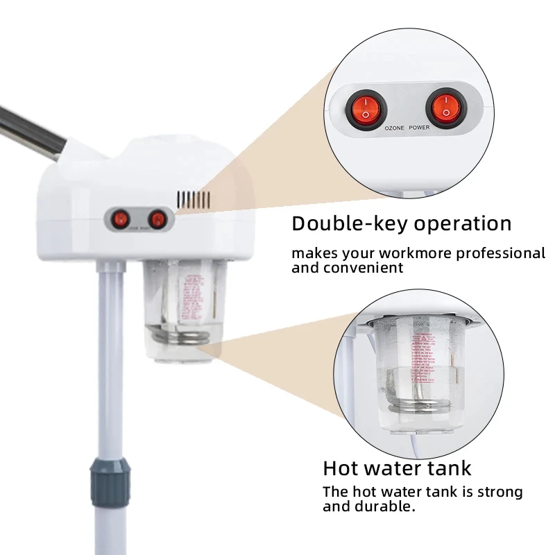 EASY TO OPERATE - Salon Facial Steamer with is easy to use at home and in the beauty salon or spa. Just pour water into the cup/jar, turn the power on and wait for 10 to 15 minutes of warmup and start of fogging. Place the rotatable spray head in the most comfortable position to help you relax while steaming. Do your own facial at home with this portable and easy to assemble steamer.
