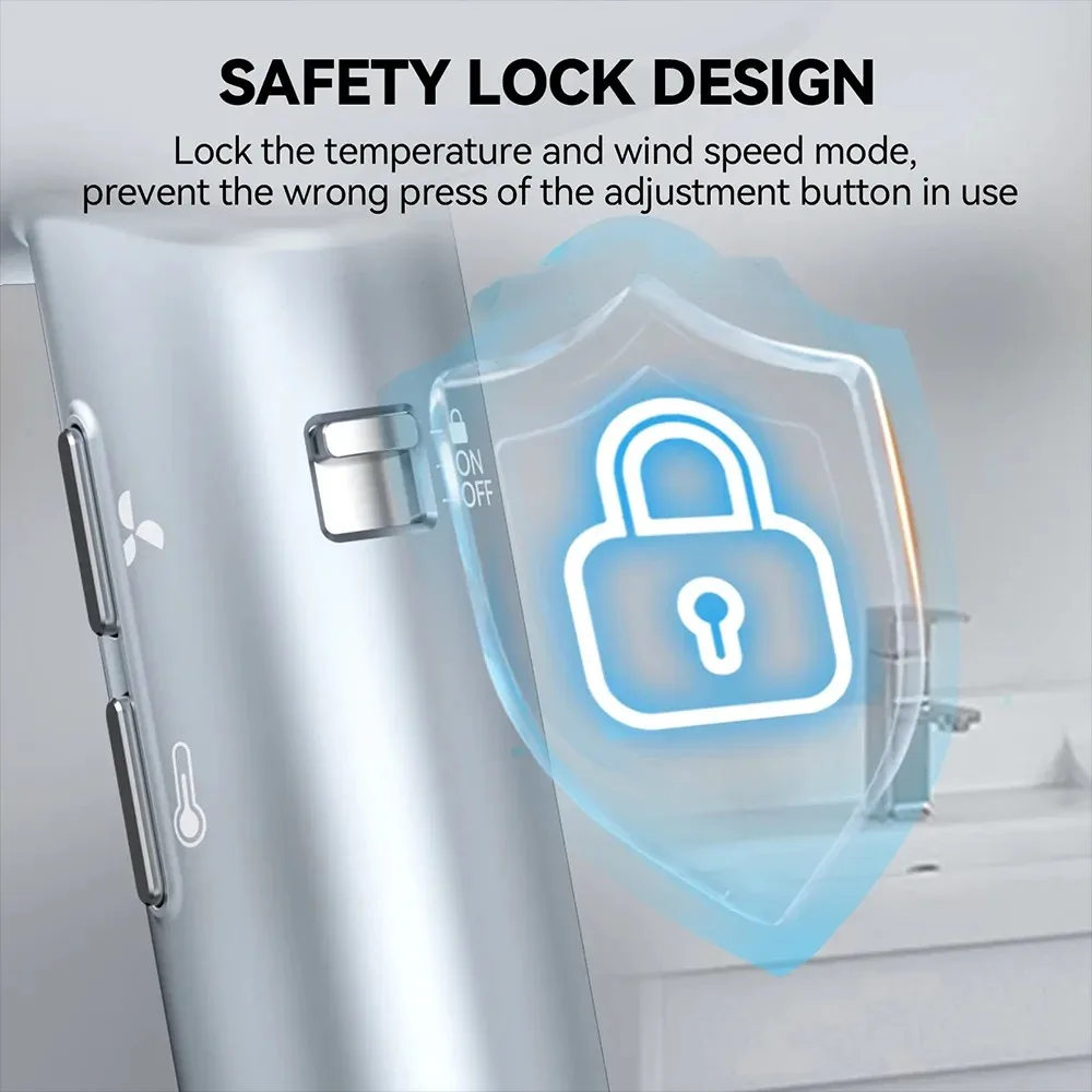 6.The hair dryer is designed with locking temperature and wind speed buttons. Prevent accidental touch of the adjustment button during use.