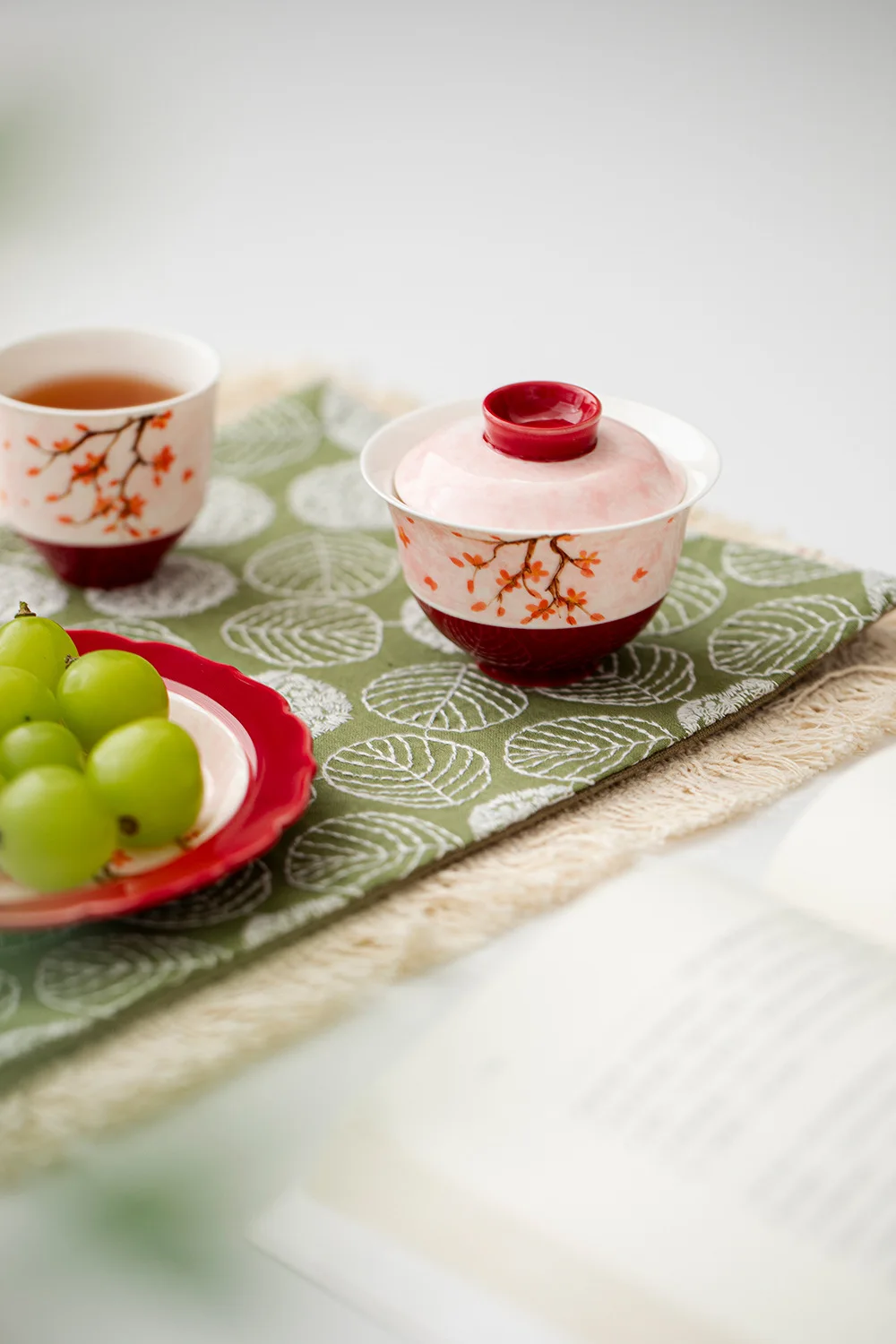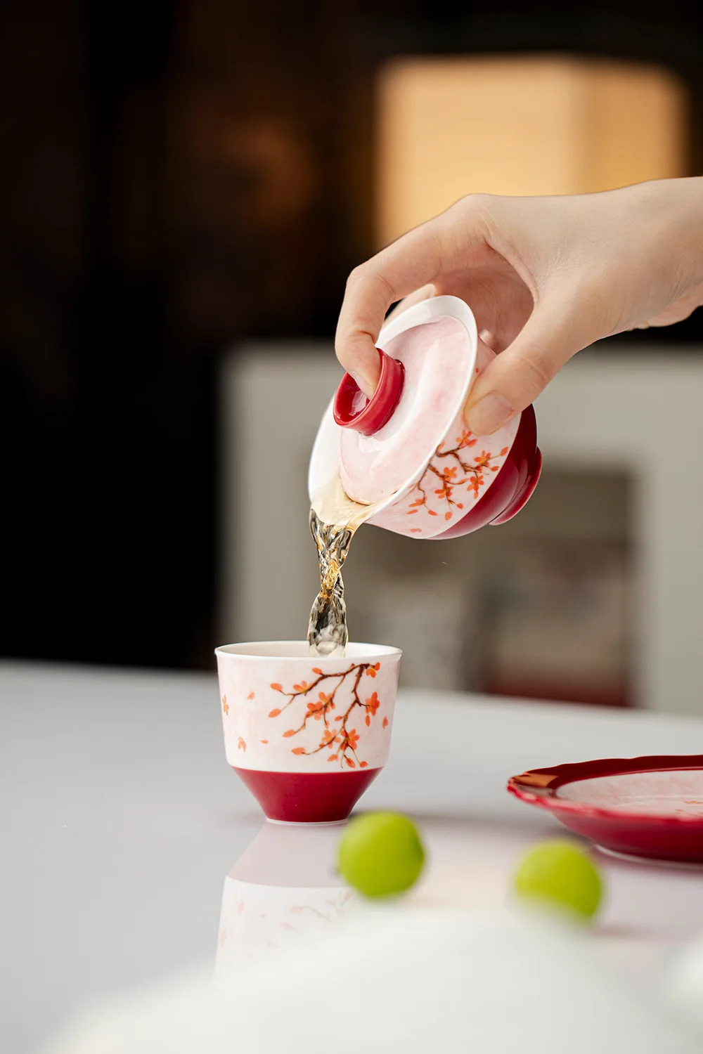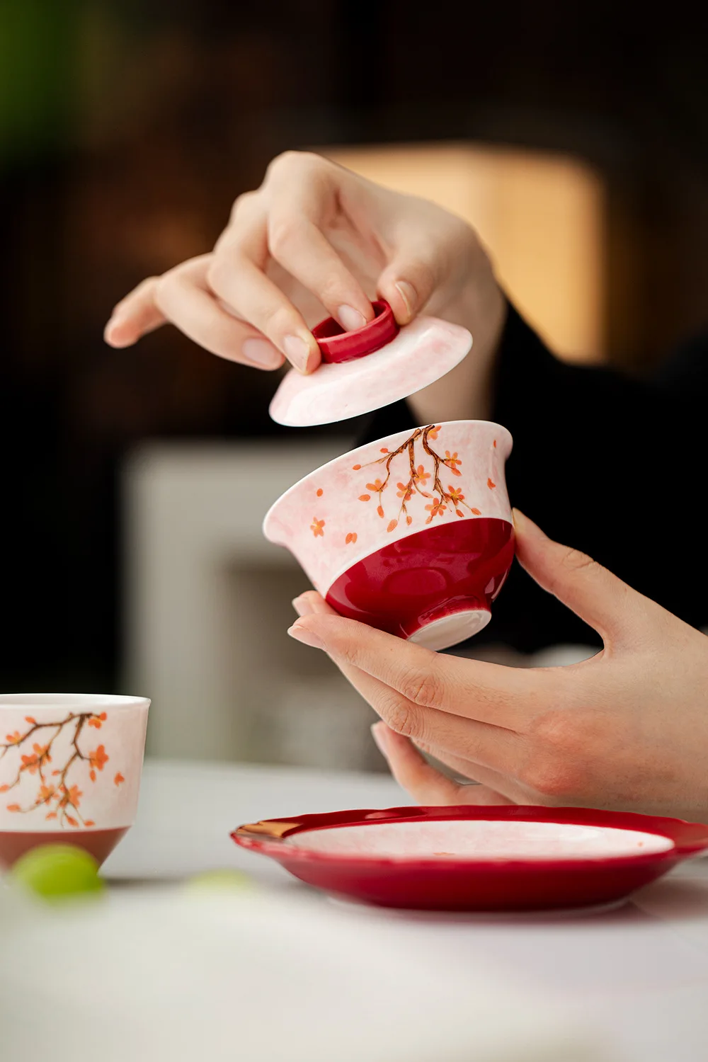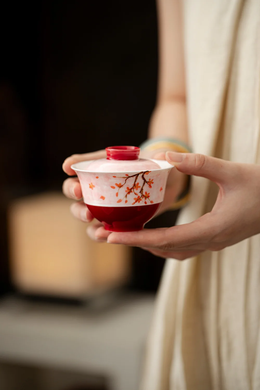 - Red plum blossom hand-painted cover bowl Household brewing tea bowl Kung Fu tea set Guochao ceramic thin tire cover bowl