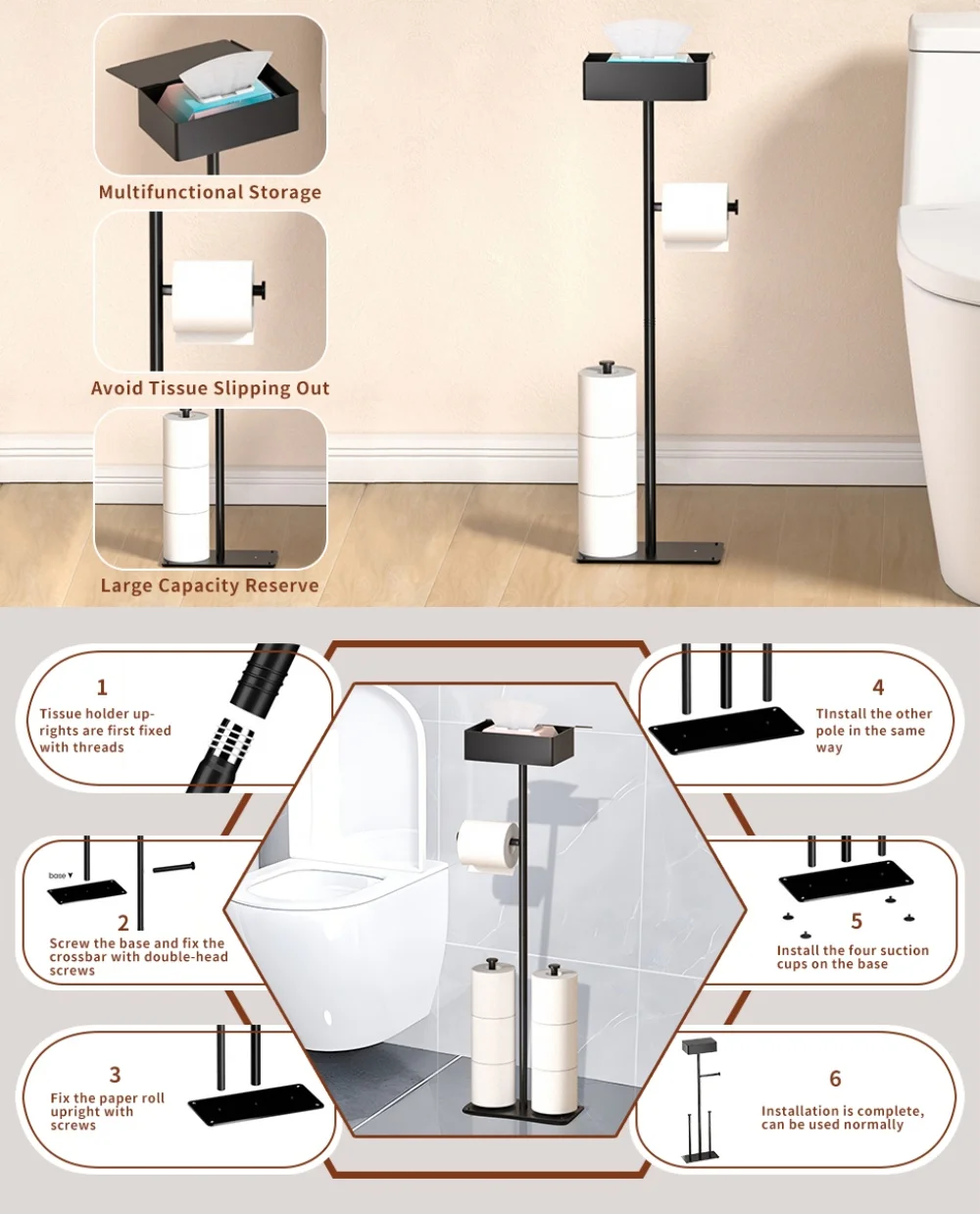 Easy to install: Just connect the toilet paper holder stand with screws tightening within 1 minutes.