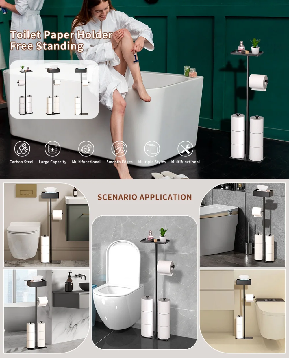 High Quality: The free standing toilet paper holder made of high caliber metalwork for durability, dependability, resistance to rust, corrosion, and scratching.