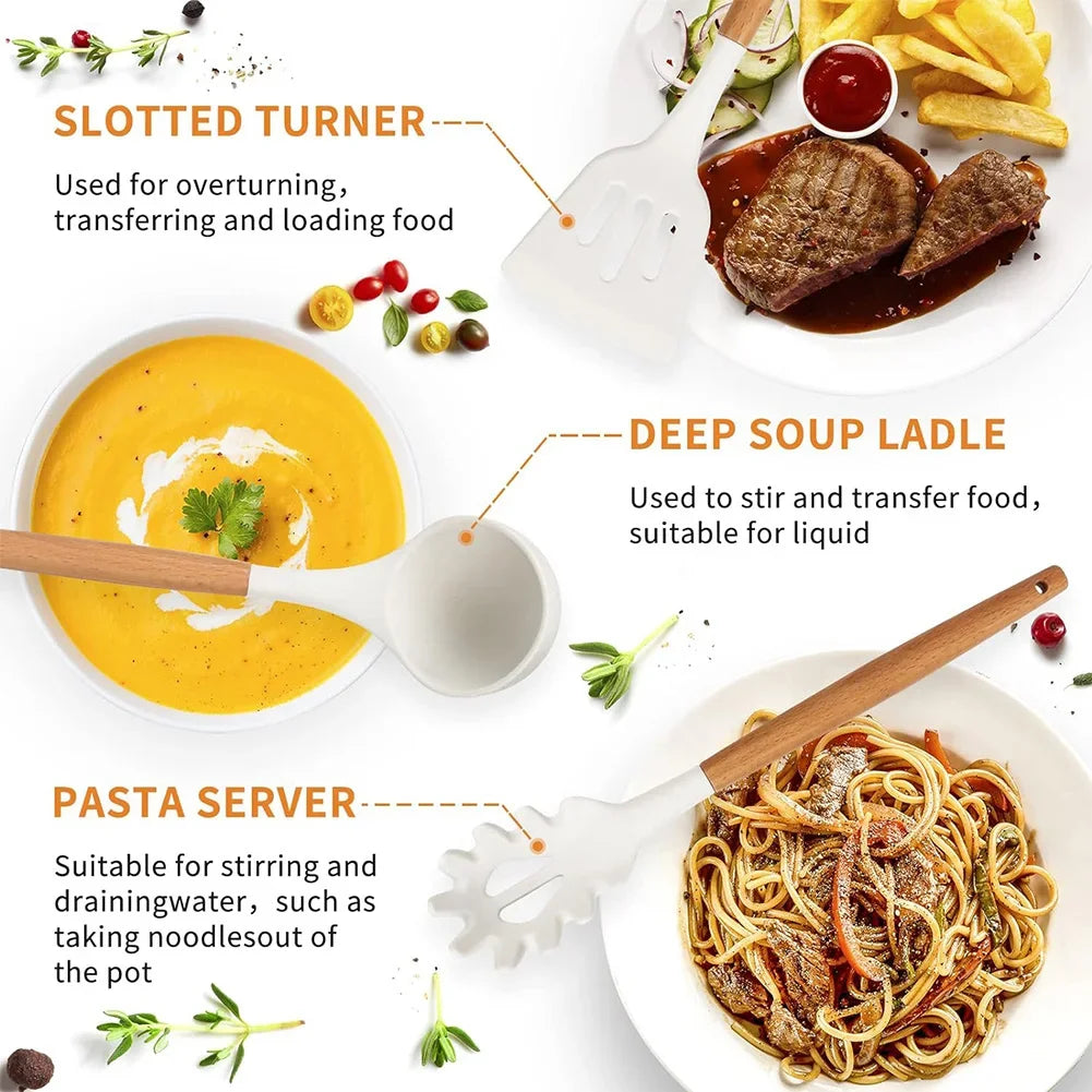 12Pcs Kitchen Utensil Set Silicone Spatula Set Wooden Handle Heat-Resistant Cookware Spatula Spoon Brush Whisk for Home Kitchen