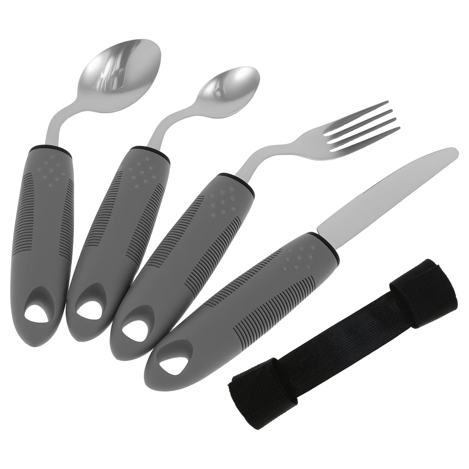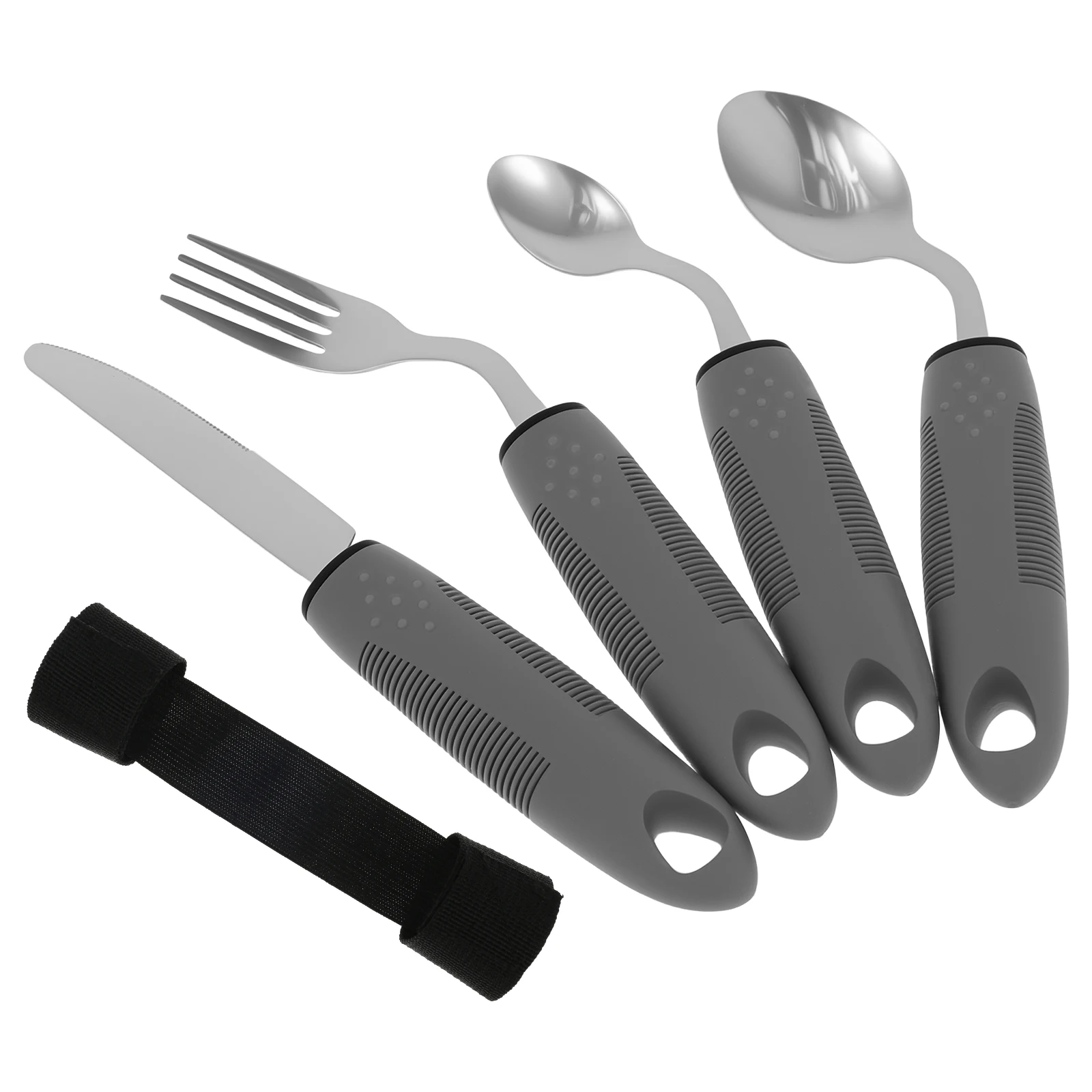 Set Design : This set includes 1 straight knife , 1 fork , 1 large spoon , 1 small spoon , and 1 fixing strap . The handle features an ergonomic design , which can provide a more comfortable dining experience for people with hand tremors