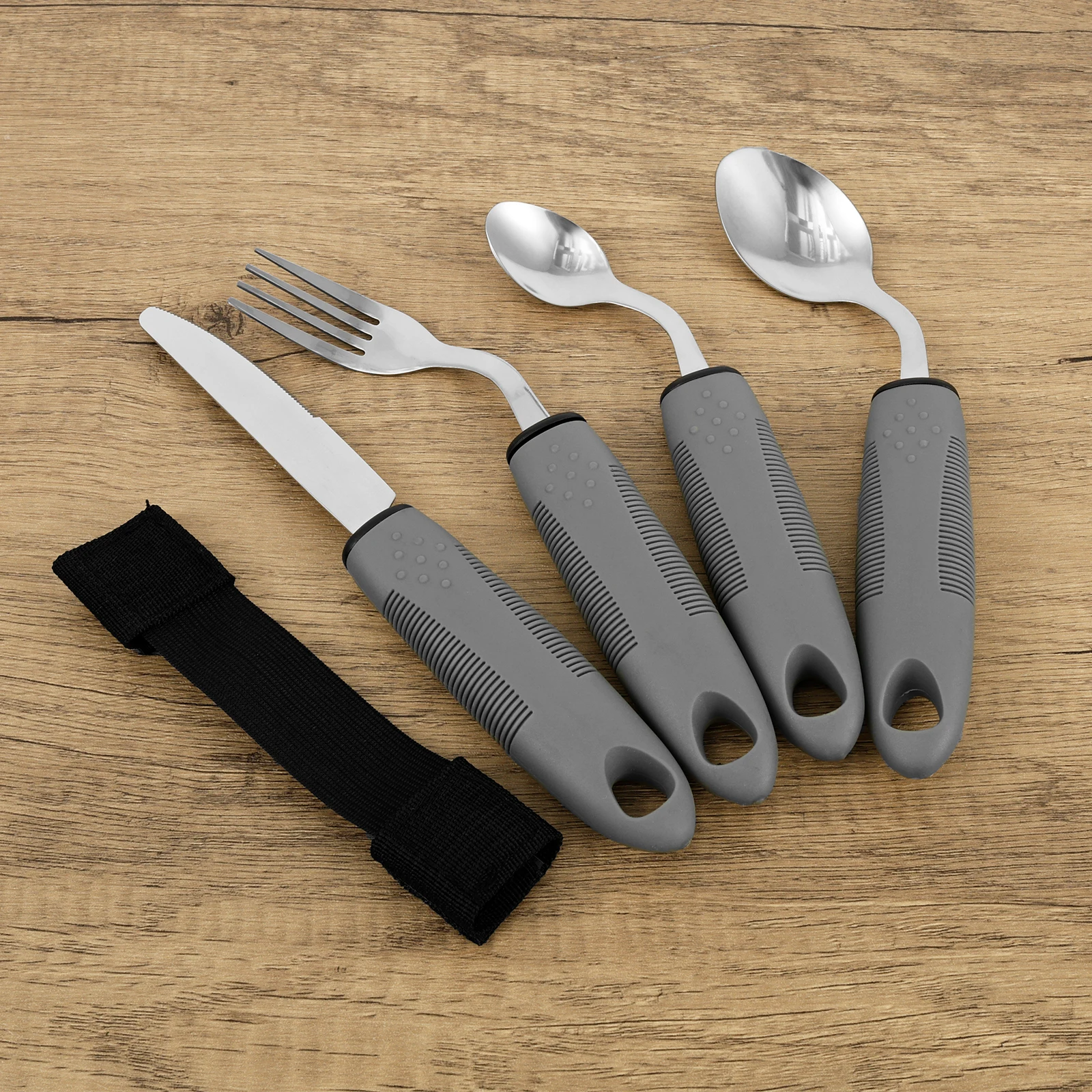 Designed for people with limited hand mobility , our adaptive utensil set makes eating easier , so mealtimes are more enjoyable . The fork and spoon feature angled design , making them more convenient to use . The handles have a certain texture , which can provide you with a more stable dining experience .